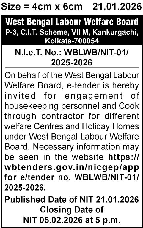 | 23 | 21-01-2026 | Invitation of e-Tender for Engagement of Housekeeping Personnel and Cook through Contractor under West Bengal Labour Welfare Board. | Download |